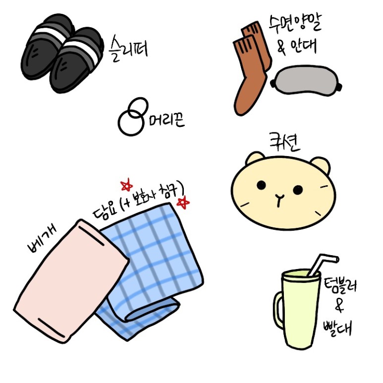 4) 쿠션 : 나는 잘 때 무언가를 안고 자는 버릇이 있어서 쿠션을 챙겼는데 이건 정말 요긴하게 쓰였다.
