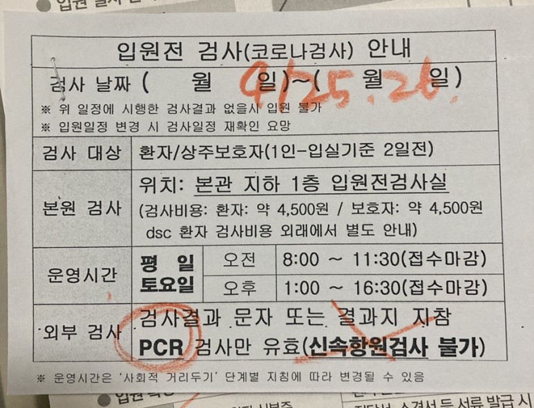 코로나 검사는 꼭 입원 이틀 전이나 하루 전에 검사한 결과에서 음성이 나와야 입원이 가능했다.