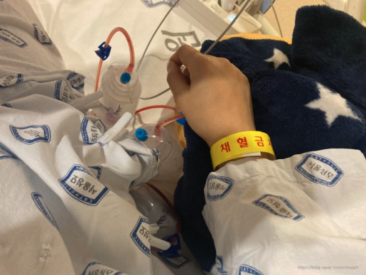 팔목에는 채혈을 하면 안된다는 채혈 금지 팔찌가 있었고 몸에 연결된 피주머니(배액관) 3개도 볼 수 있었다.