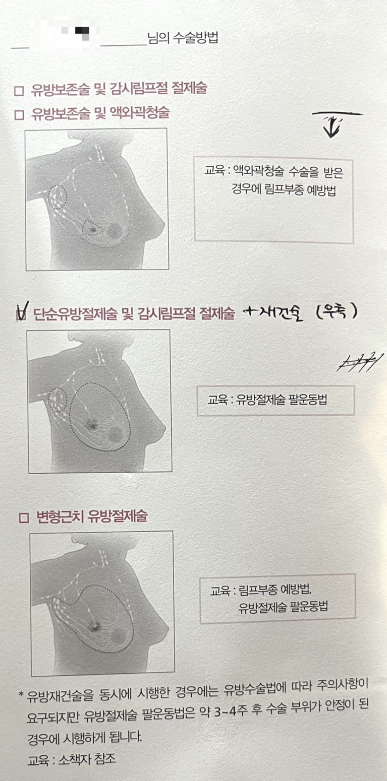 나는 우측 가슴 단순 유방절제술 및 감시 림프절 절제술과 재건술을 진행했다고