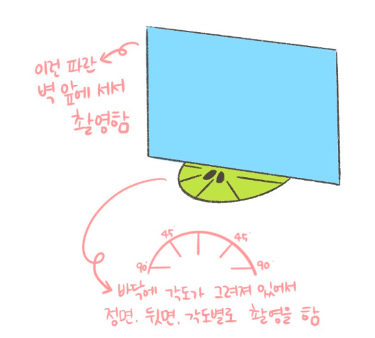 그 앞에서 촬영을 한다. 바닥에는 각도가 그려져있어 정면, 뒷면을 포함해서 각도별로 모두 촬영한다.