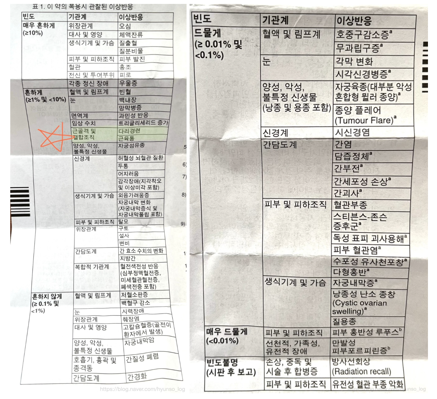 그렇다면 타목시펜 설명서에 관절통과 관절염이 부작용으로 적혀있을까?